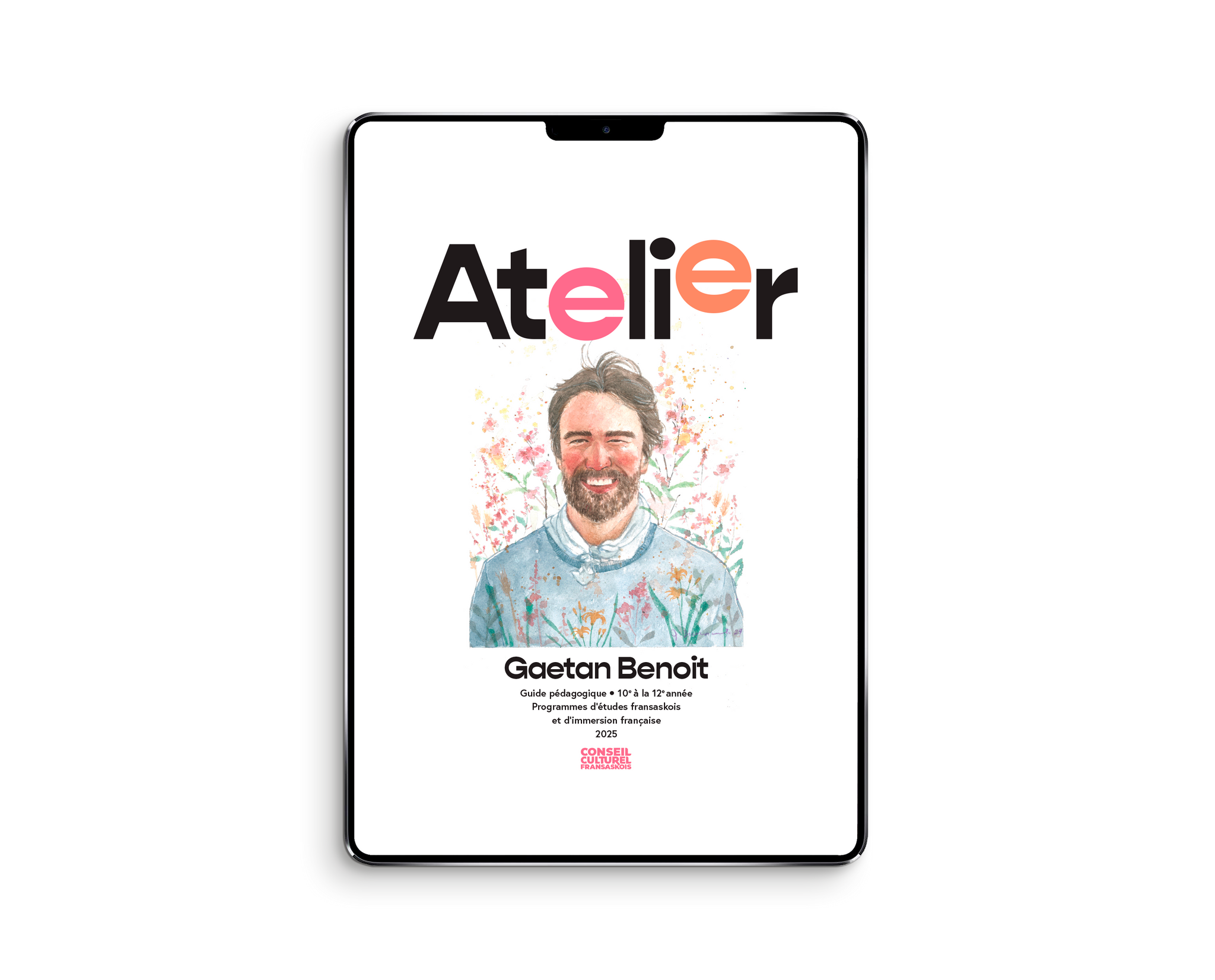 L'AteLier est une série de guides pédagogiques artistiques et culturels qui font découvrir à l'élève des artistes fransaskois.e.s de toutes disciplines.