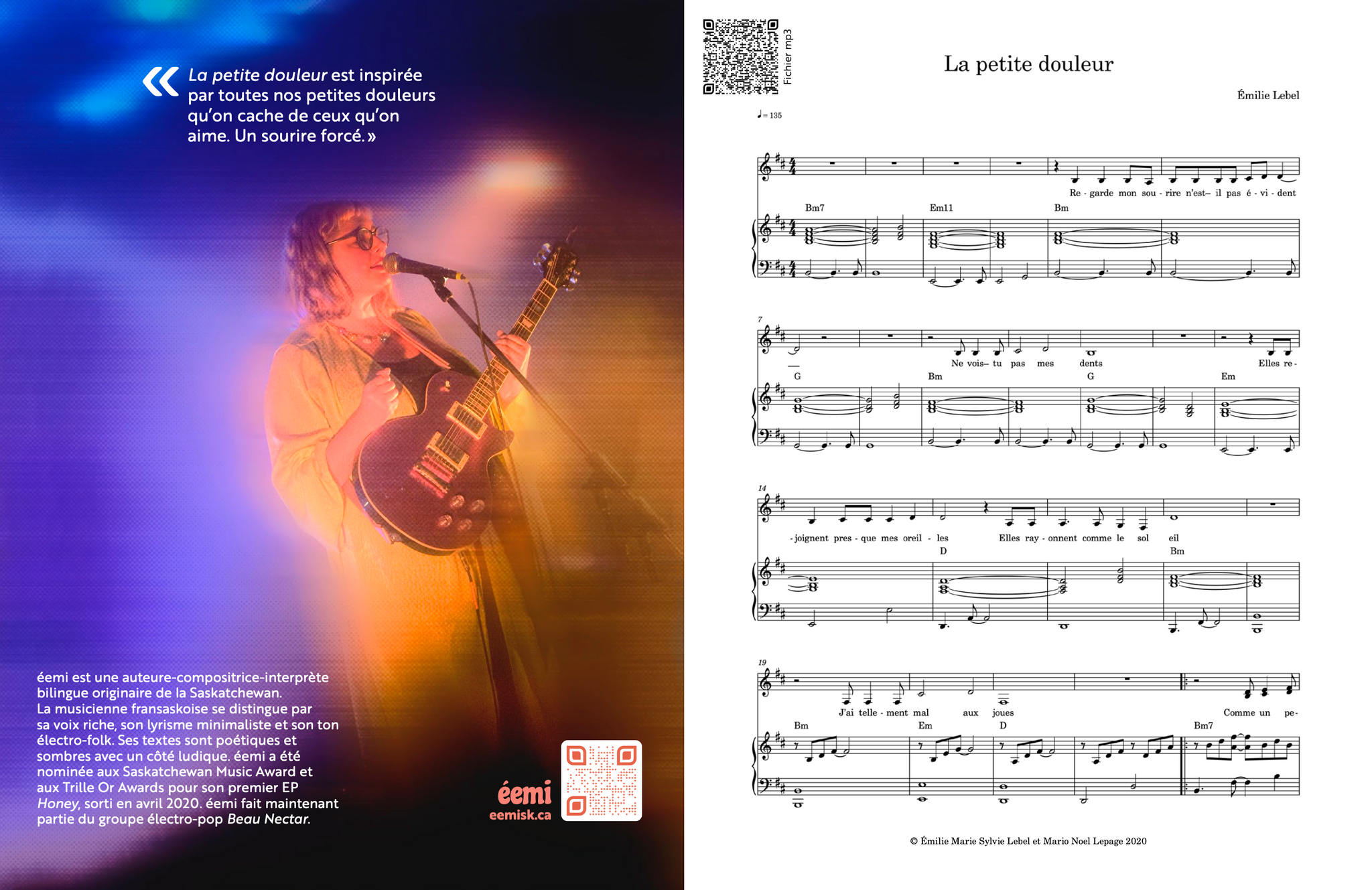 éemi est une auteure-compositrice-interprète bilingue originaire de la Saskatchewan. La musicienne fransaskoise se distingue par sa voix riche, son lyrisme minimaliste et son ton électro-folk. éemi a été nominée aux Saskatchewan Music Awards et aux Trilles Or pour son premier EP Honey, sorti en avril 2020. éemi fait maintenant partie du groupe électro-pop Beau Nectar.